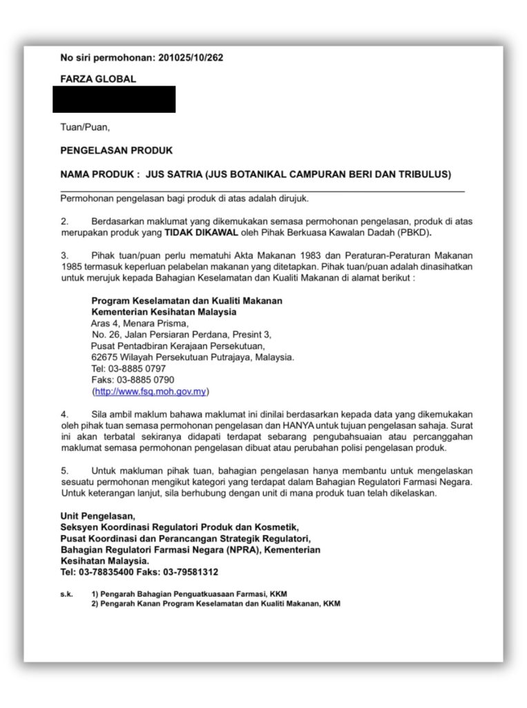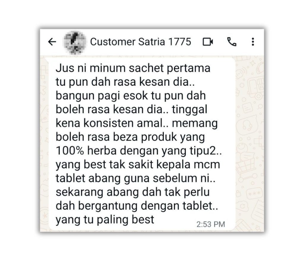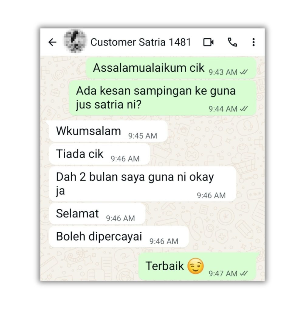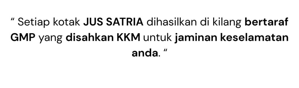Ya, Jus Satria dihasilkan di kilang berstatus GMP yang disahkan oleh Kementerian Kesihatan Malaysia (KKM). Setiap kotak melalui proses kawalan kualiti ketat untuk memastikan ia selamat digunakan.